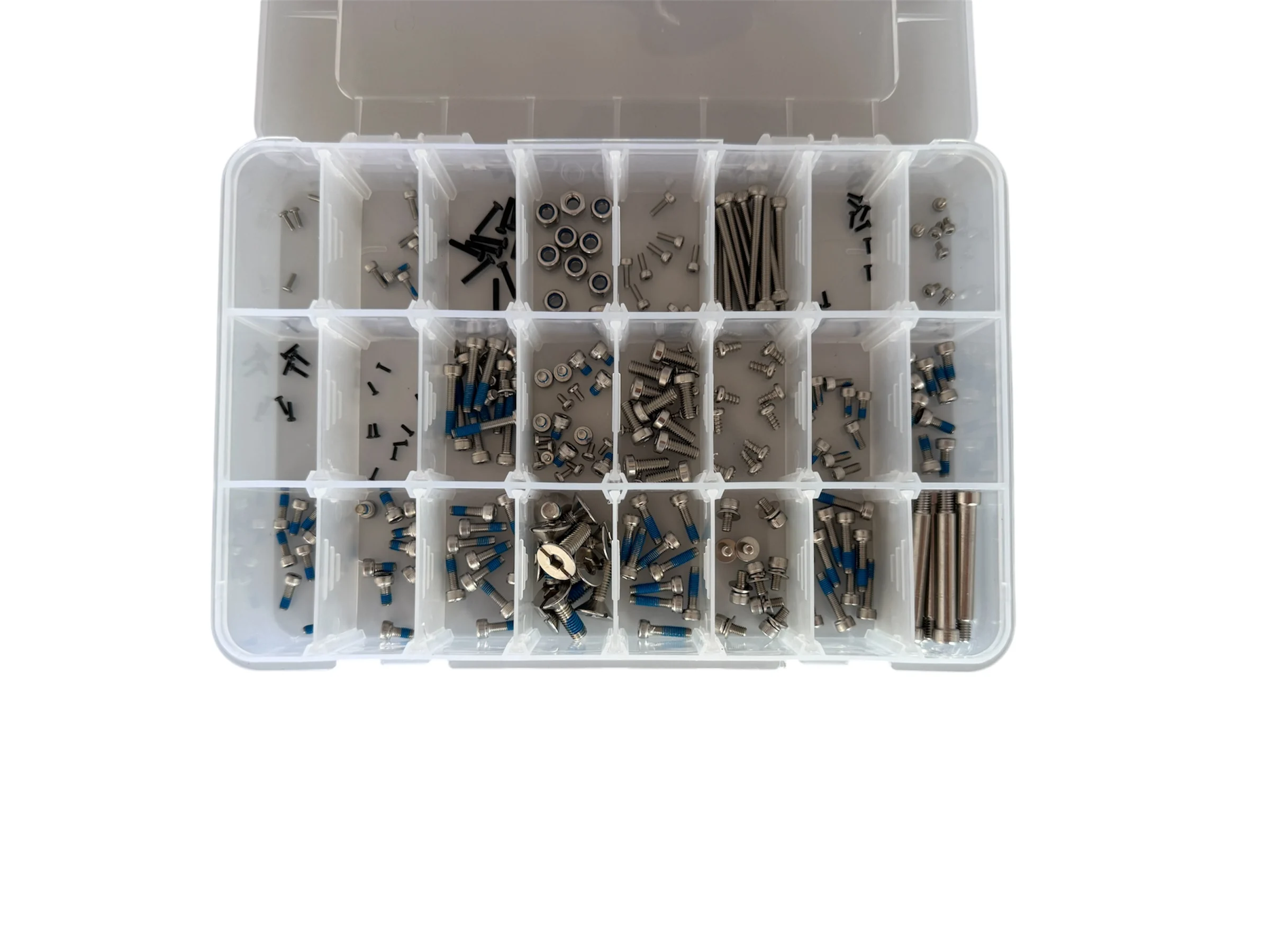 El kit de 270 tipos de tornillos compatibles con DJI reúne la tornillería más utilizada en el mantenimiento y montaje de drones, incluyendo series agrícolas como DJI Agras (T30, T40, T50) y otros modelos de la marca (según medida). Es un surtido pensado para reparaciones rápidas en campo, sustitución de tornillos perdidos o dañados y ajustes preventivos en carenados, brazos, soportes de trípode, chasis y accesorios de pulverización.